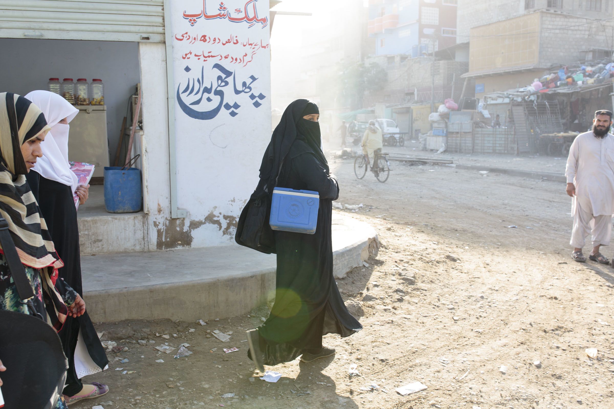 It’s 7 am and the sun is baking the rooftops and roads of Kemari, a dusty suburb of Karachi. About 30 women, most in niqab, gather on a small rooftop and listen to instruction about the day’s work. It’s going to be hot and difficult, as the women prepare to visit dozens of households before the day is done. They are community-based vaccinators.